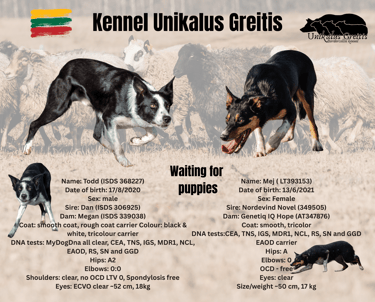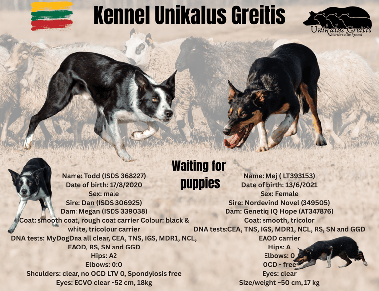 Laukiami Mej ir Todd Borderkolių veislės šuniukai 2025m. liepos mėnesį! Mej ir Todd yra Open klasės lygio šunys. Mej - Unikalus Greitis veislyno šuo galintis dirbti su įvairių rūšių gyvūnais. Todd - patinas iš Vokietijos yra daugelio prizinių vietų laimėtojas ganymo varžybose. Abu šunys yra puikaus temperamento, labai gerų genetinių linijų, lengvai valdomi ir turi puikius sveikatos tyrimus.